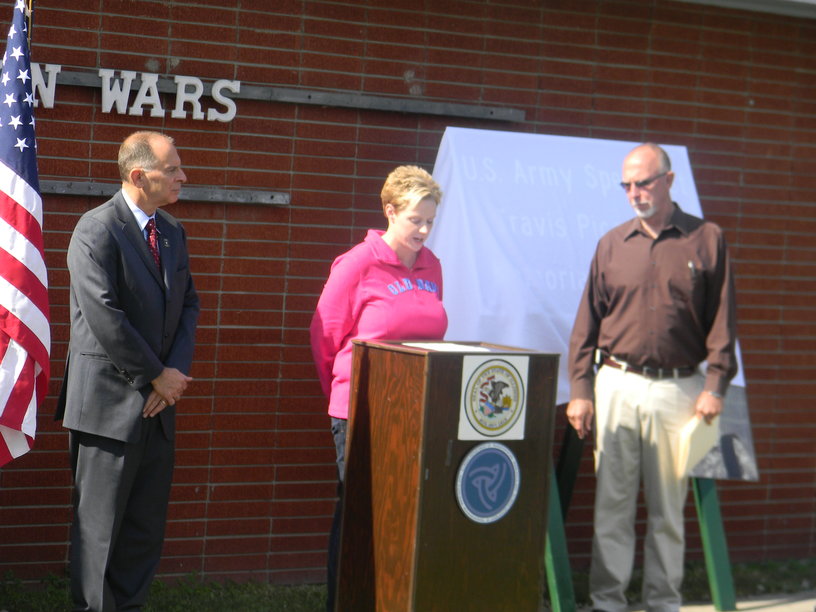 Megan Bowlin, center, is pictured speaking on Tuesday afternoon at a dedication ceremony for her late brother, U.S. Army Specialist Travis Picantine. Also pictured are, left, Gen. Bill Enyart and, right, state Sen. Gary Forby.