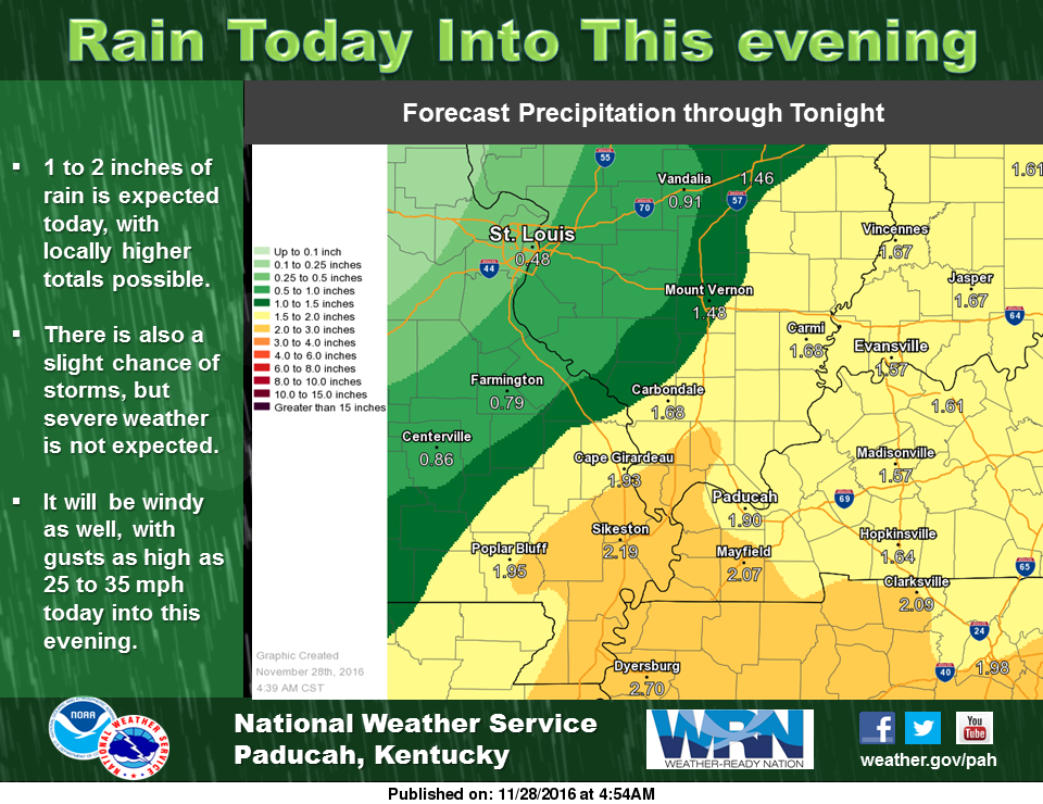 The National Weather Service has forecasted 1″ to 2″ of rain acrossforecast-11-28 the region:  High of 57 today with gusty winds up to 25-35 mph.;  Tonight a low of 45;  A high of 65 tomorrow with a cooling trend coming.