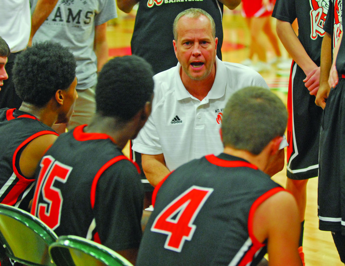 Doug Creel, in his second stint as Mt. Vernon head coach, talks to his team during the 2015-16 season.
