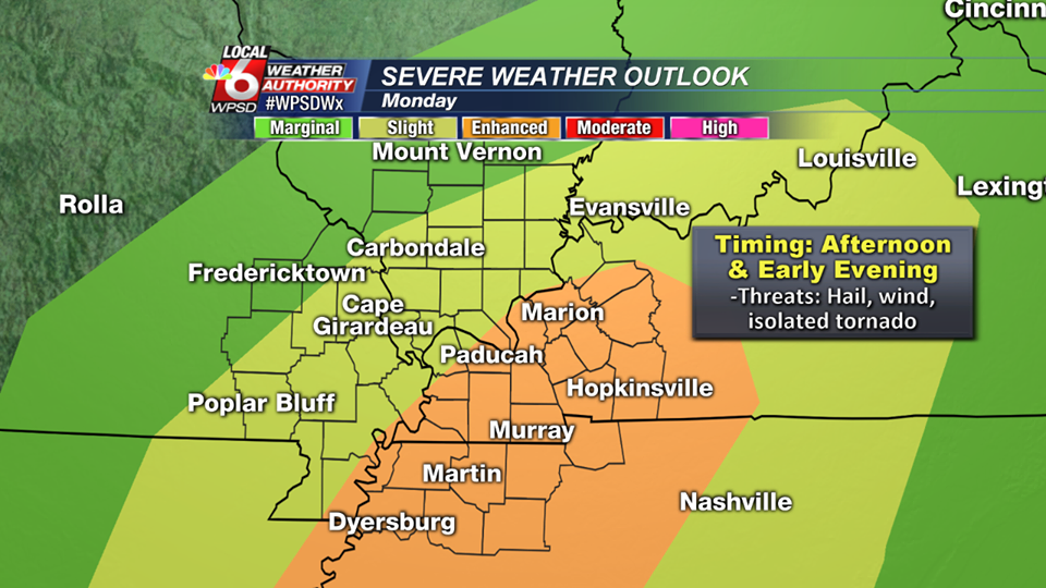 The main threat, for tomorrow afternoon and evening, will be large hail and damaging winds. Here is the latest hazardous weather outlook from the National Weather Service in Paducah KY.