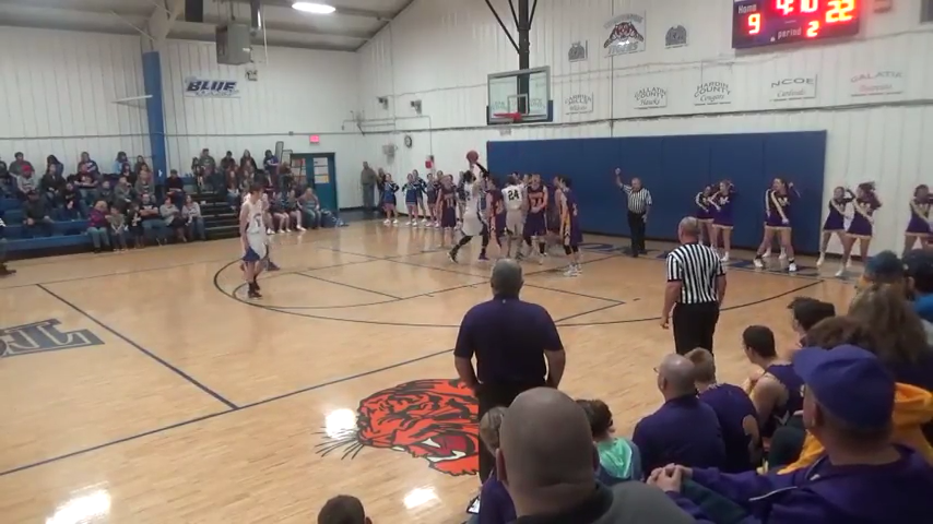 Tiger Freshman Corbin Fitch comes up from the steal as the tigers go on the break. (Thompsonville Tigers YouTube page)